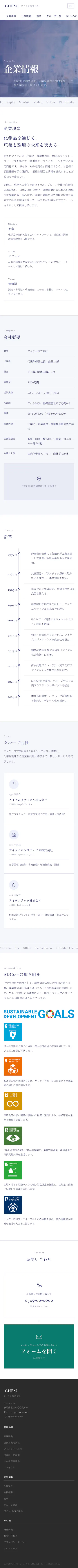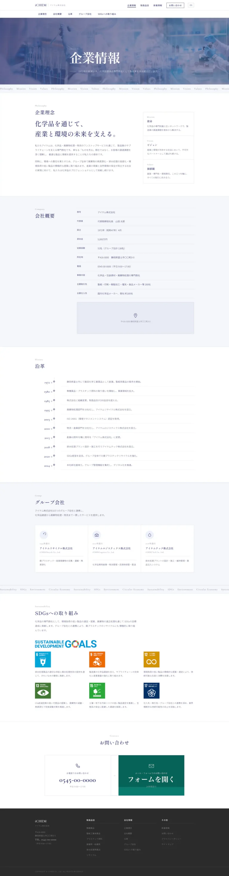 企業理念・会社概要・沿革・グループ会社・SDGsへの取り組みの5セクション構成。ブランドの統一感を保ちながら各セクションへの導線を明確化した。SDGsセクションでは関連する6つの国連SDGsオフィシャルロゴを掲載した。