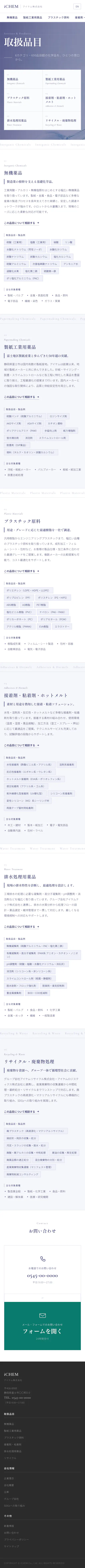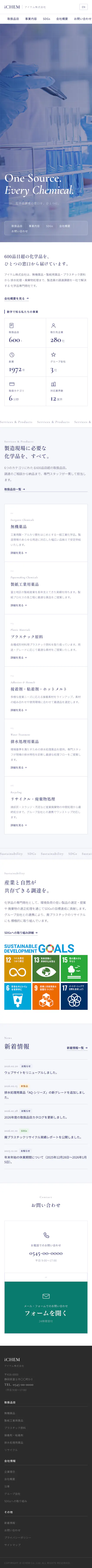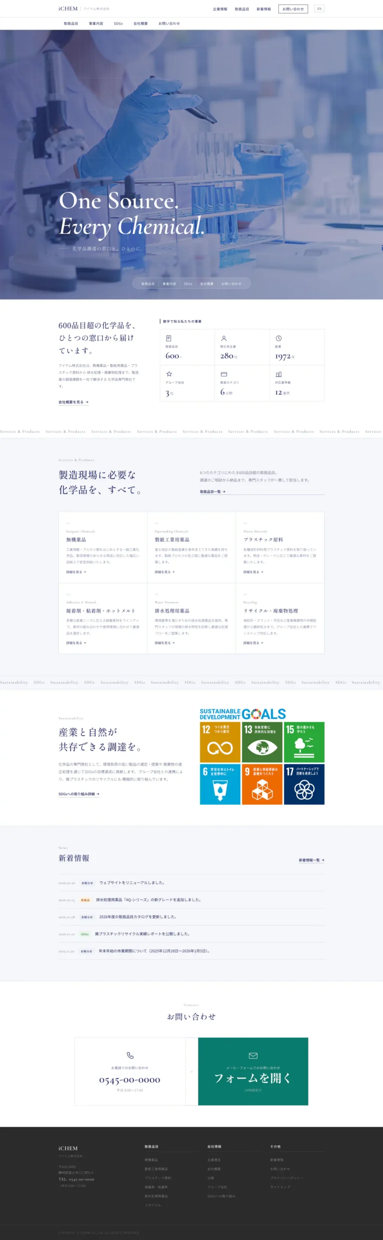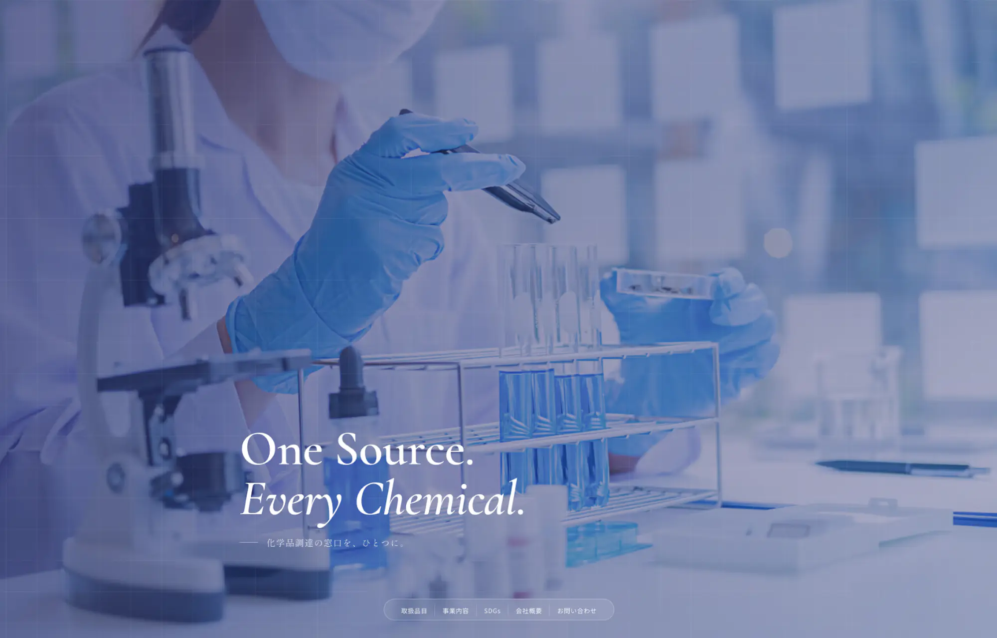化学品専門商社のコーポレートサイト。Astro+TailwindCSSで構築し、高速表示を実現。深みのあるネイビーを基調に、ティールのアクセントカラーを効かせたB2B向けの洗練されたデザインに仕上げた。
