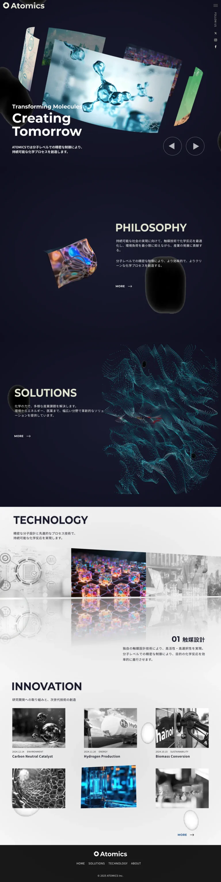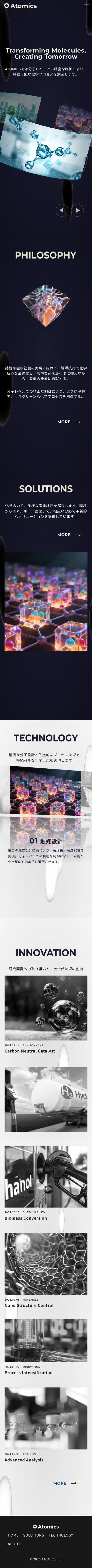 ファーストビューでは動画素材を組み込んだグローバルスライダーと、GLSLシェーダーによる波打つテキストアニメーションが強い第一印象を与える。スクロールに連動するPHILOSOPHYセクションでは、立体的なビジュアルに企業理念を重ね合わせ、抽象的な技術世界を表現。SOLUTIONSセクションでは動画素材が粒子状にバラバラになり、異なる素材が再構築される演出で、製品の変革性を象徴させた。TECHNOLOGYセクションでは鏡面反射スライダーと触媒技術の解説を組み合わせ、先進性を視覚化。カスタムマウスカーソル・スムーススクロール・SPAライクなページ遷移アニメーションにより全体の完成度を底上げしている。