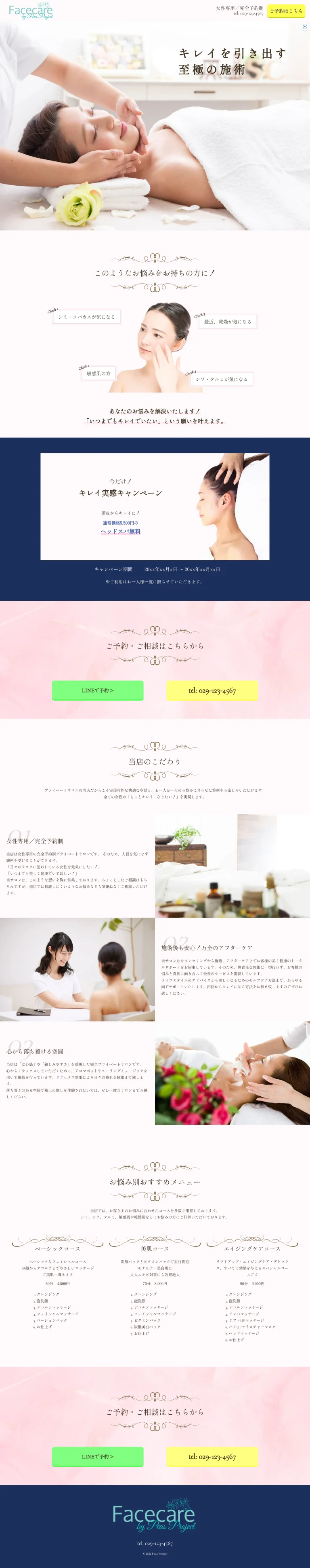 肌に悩みを抱えた女性への訴求を意識して、悩みへの理解、キャンペーン情報やサロンの強みを伝わりやすくデザインしました。