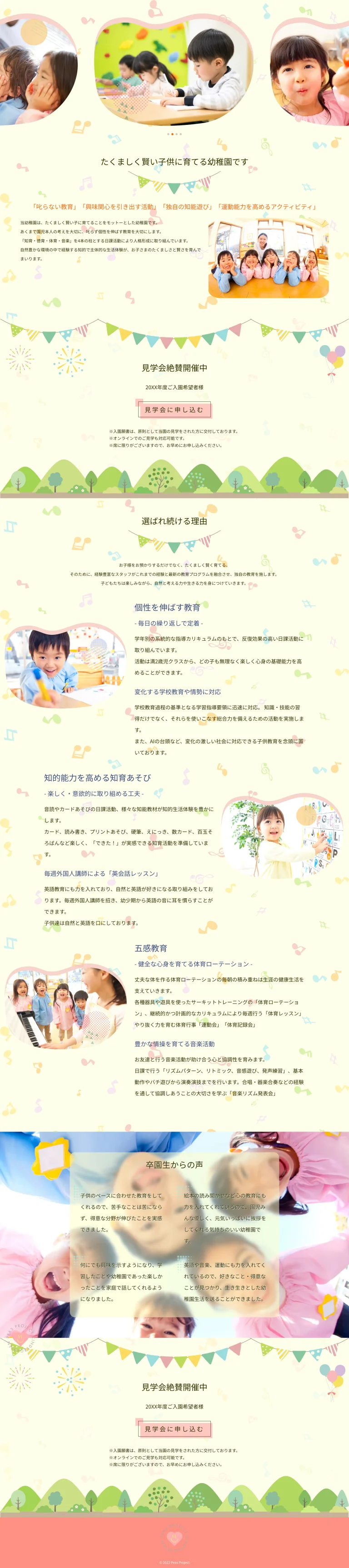 明るい幼稚園の雰囲気を表現するためスライダーを設置したり、バックグラウンドや装飾に音符やアーチ、バルーン、山などをあしらったりしました。