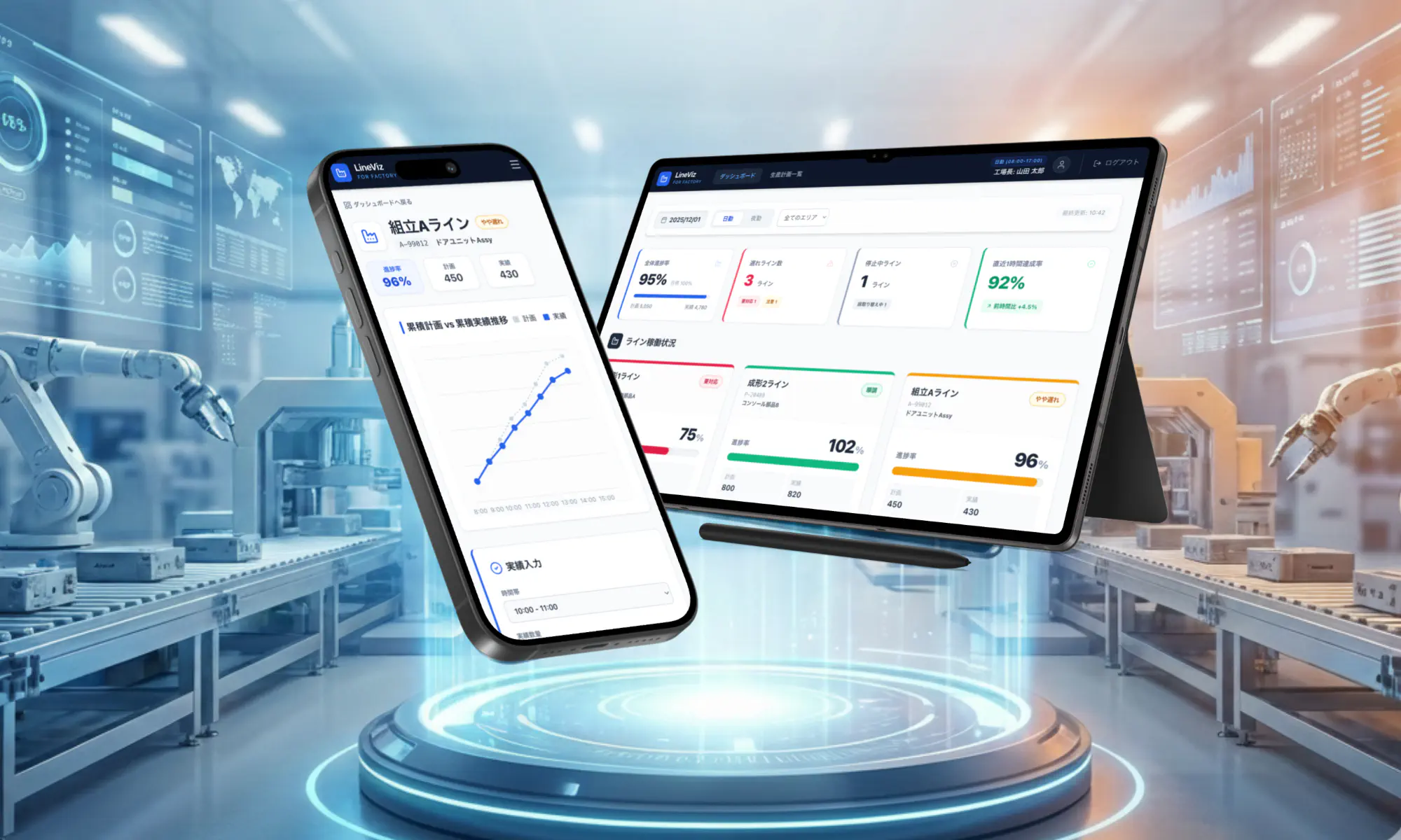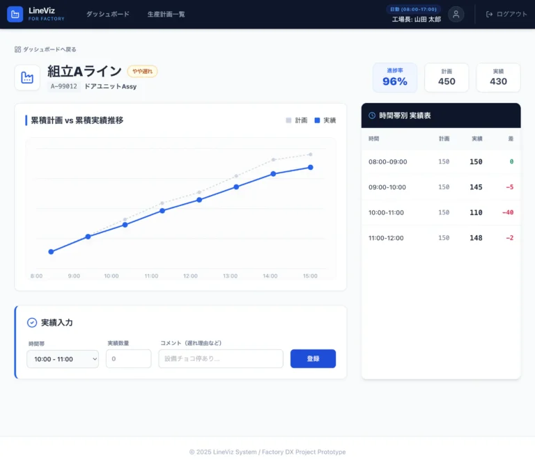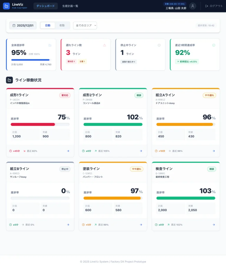 メインエリアには各ラインの状況をカード形式で並べ、進捗率やトレンドをグラフとアイコンで表示しています。