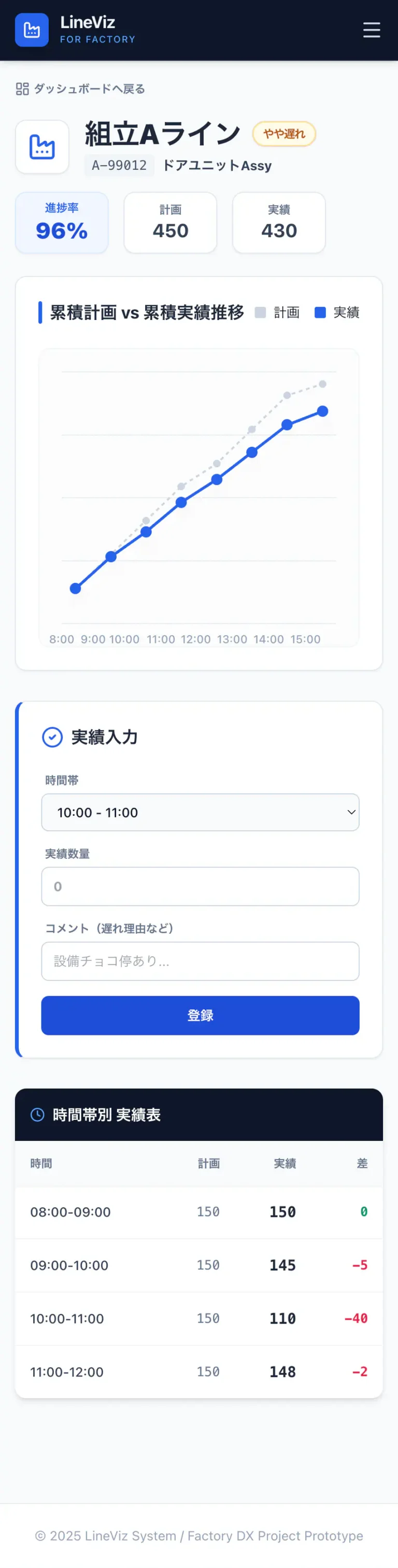 また、現場からの報告用としてシンプルな実績入力フォームを用意しました。時間帯ごとの詳細なデータも表で確認でき、問題の原因特定や改善アクションにつなげやすい構成にしています。