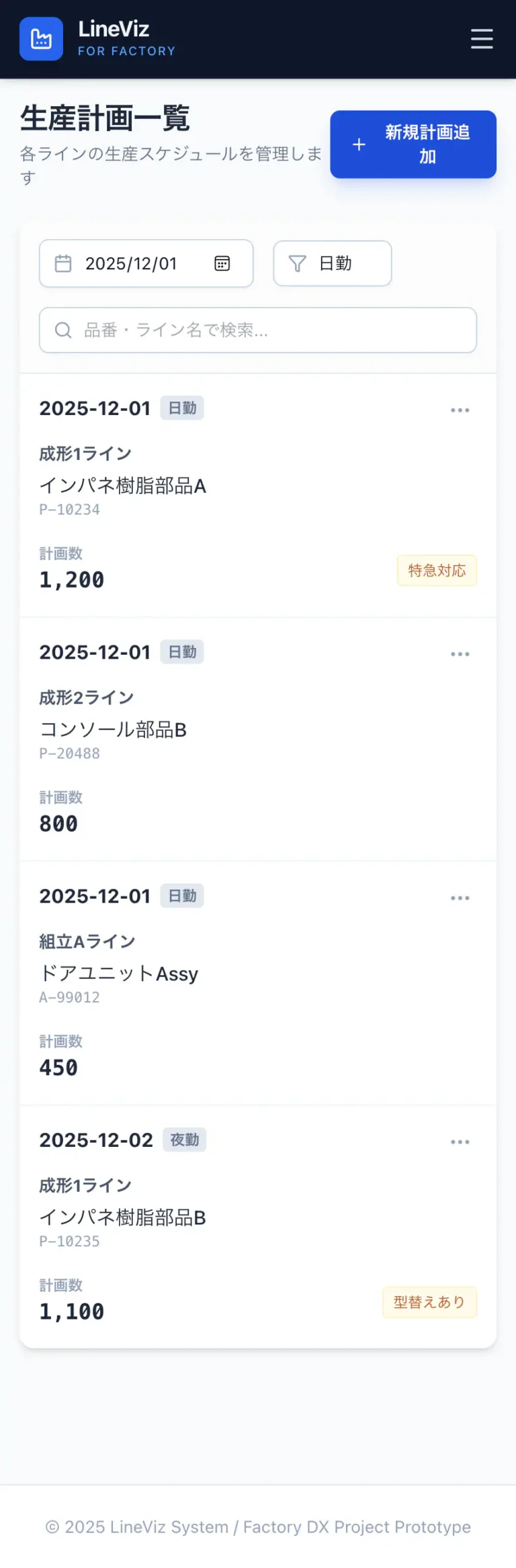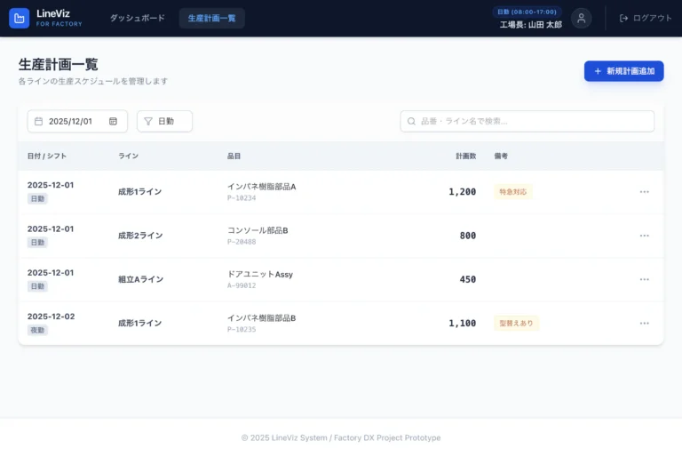 毎日の生産計画を管理する一覧画面です。日付やシフト、ライン名などで絞り込みができ、必要な情報にすぐにアクセスできます。