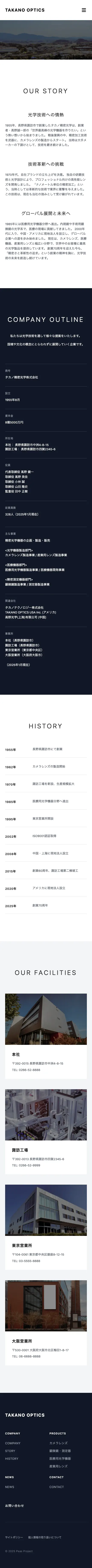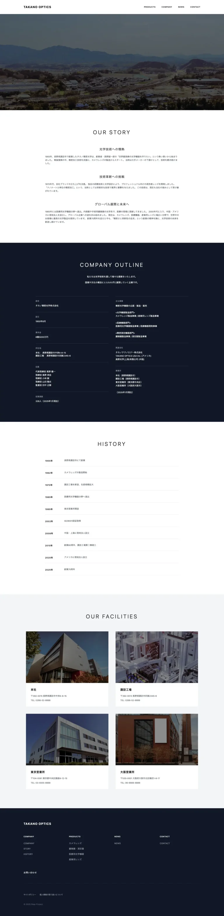 企業概要、沿革、アクセス情報を掲載しています。タイムライン形式の沿革表示により、70年以上の歴史を視覚的に分かりやすく伝えています。各拠点へのへのアクセス情報をシンプルにわかりやすく提供しています。