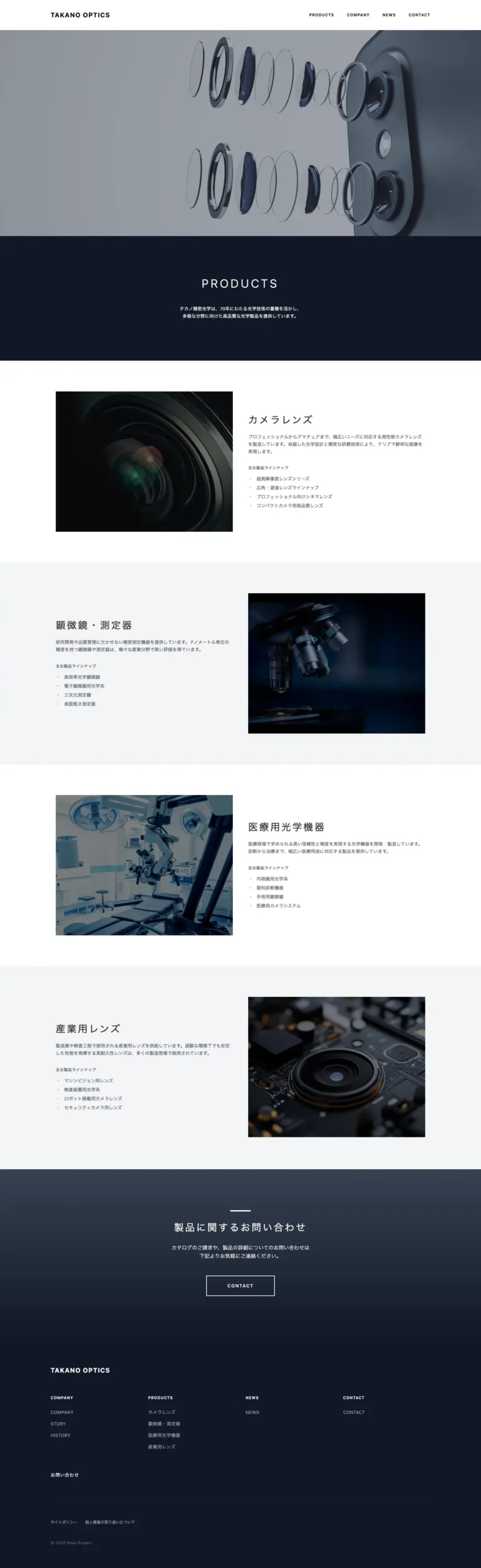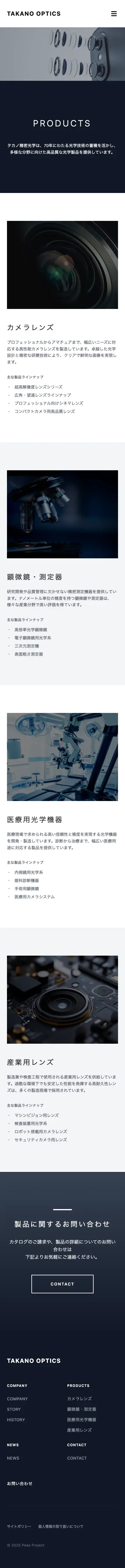医療用レンズ、産業用レンズ、カメラレンズ、顕微鏡レンズの4カテゴリーを紹介しています。
