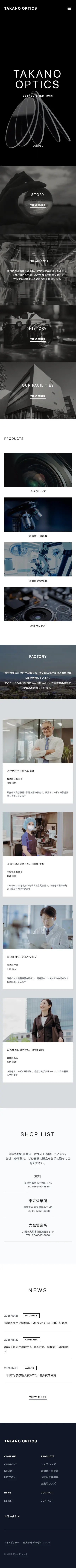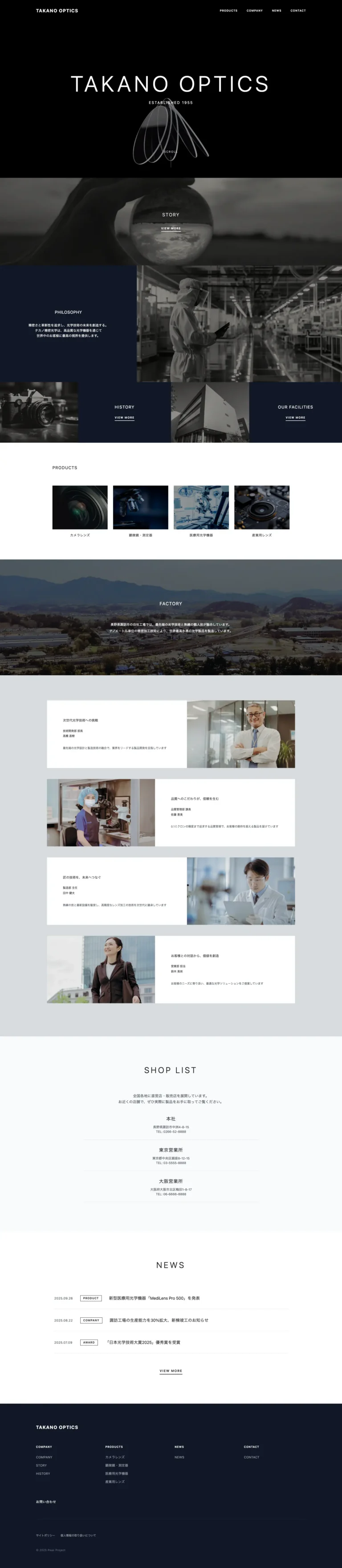 企業理念、製品紹介、拠点紹介、企業文化、従業員の声、最新ニュースを1ページに集約し、訪問者が企業全体を俯瞰できる構成になっています。