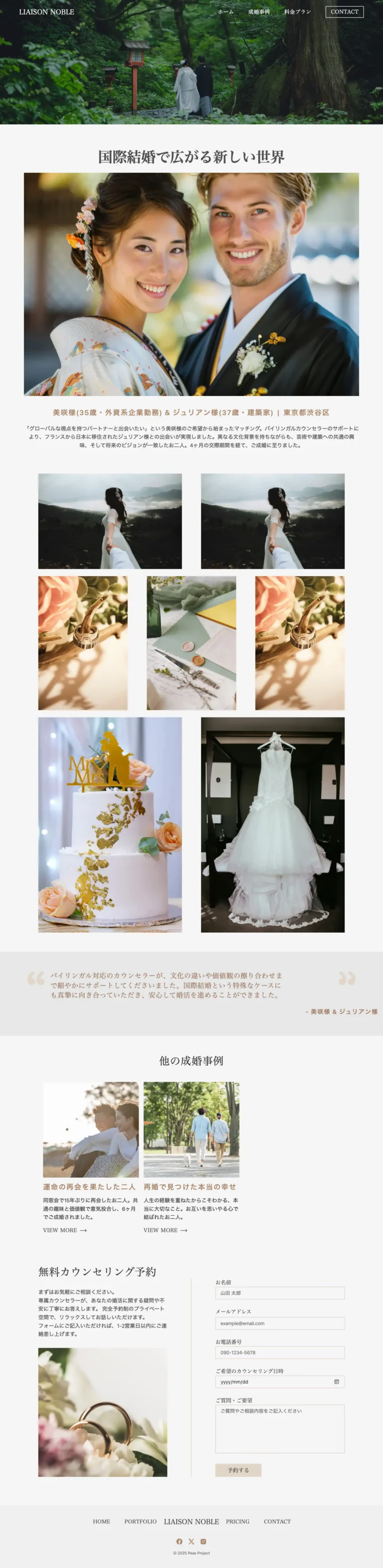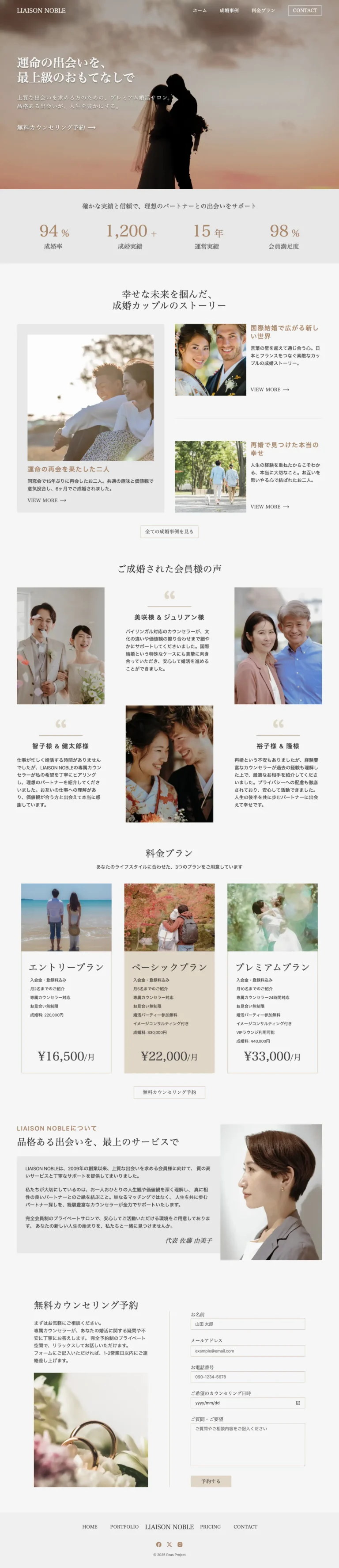 成婚事例、料金プラン、お客様の声などを掲載し、ターゲット層に信頼感を与えるプレミアムな印象を演出しています。