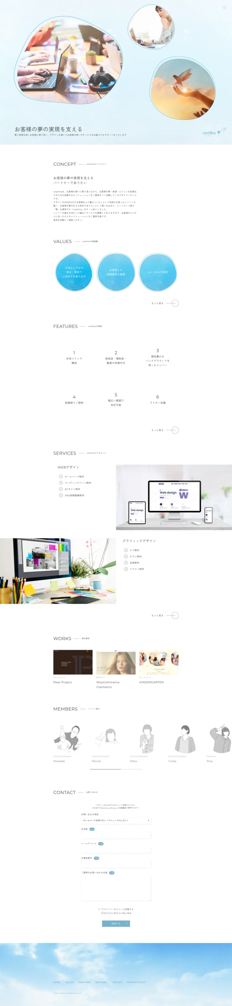 チームのConcept, Values, Services, Works, Membersなどをシンプルかつわかりやすく表示するデザインとしました。